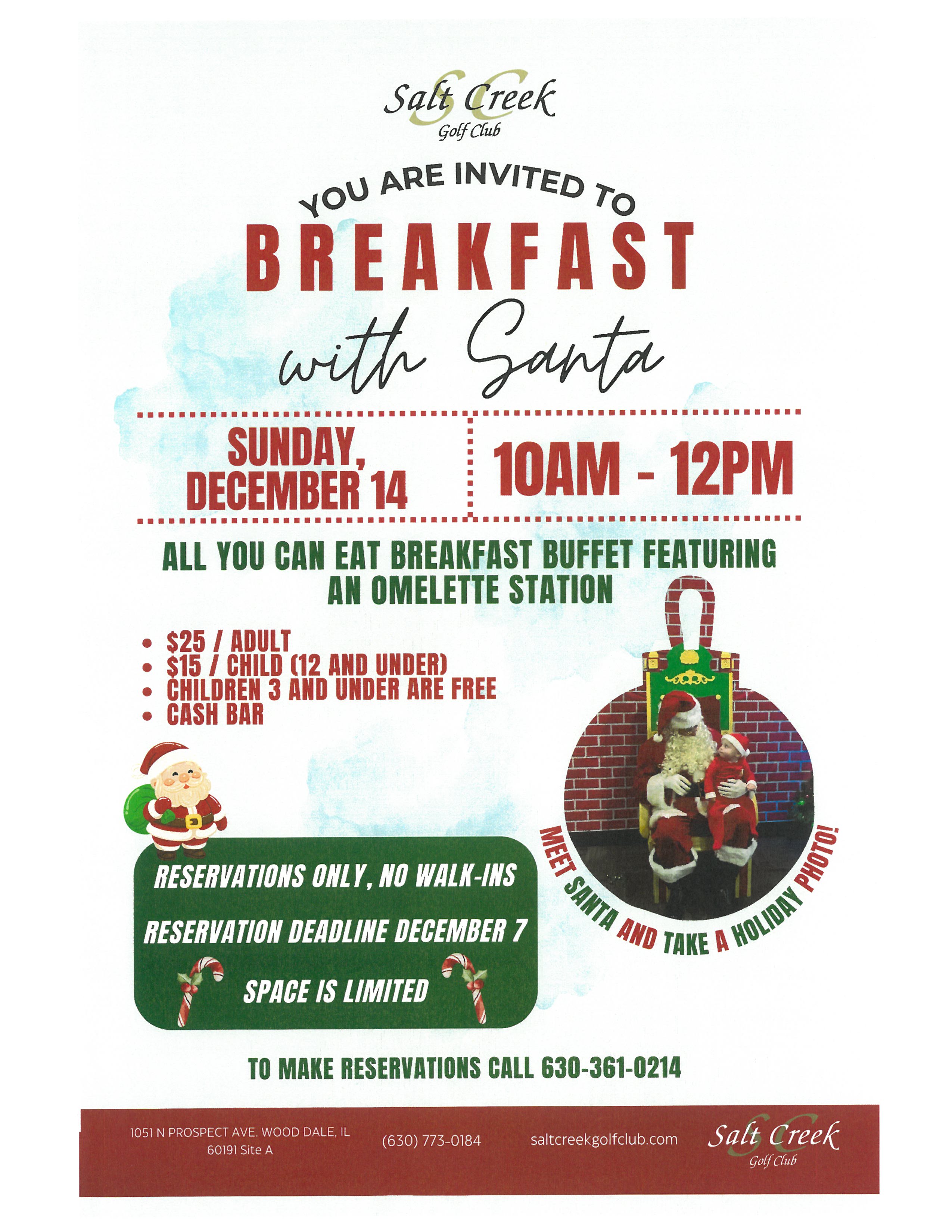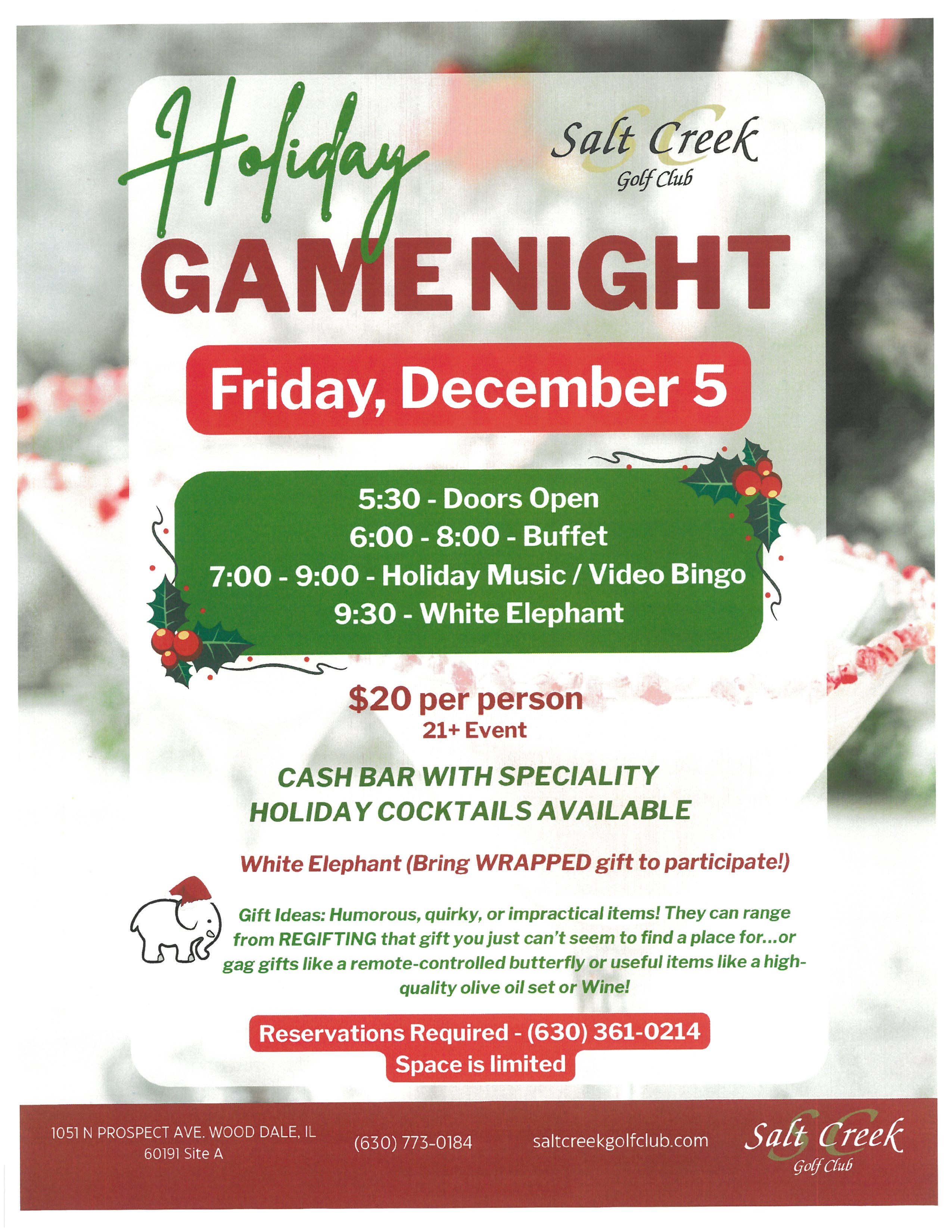 Upcoming Events September 9/21 Bears Golf Outing and Viewing Party October 10/9 Wine Tasting November December 12/5 Holiday Game Night 6-10PM12/14 Breakfast with Santa 10am-12pm